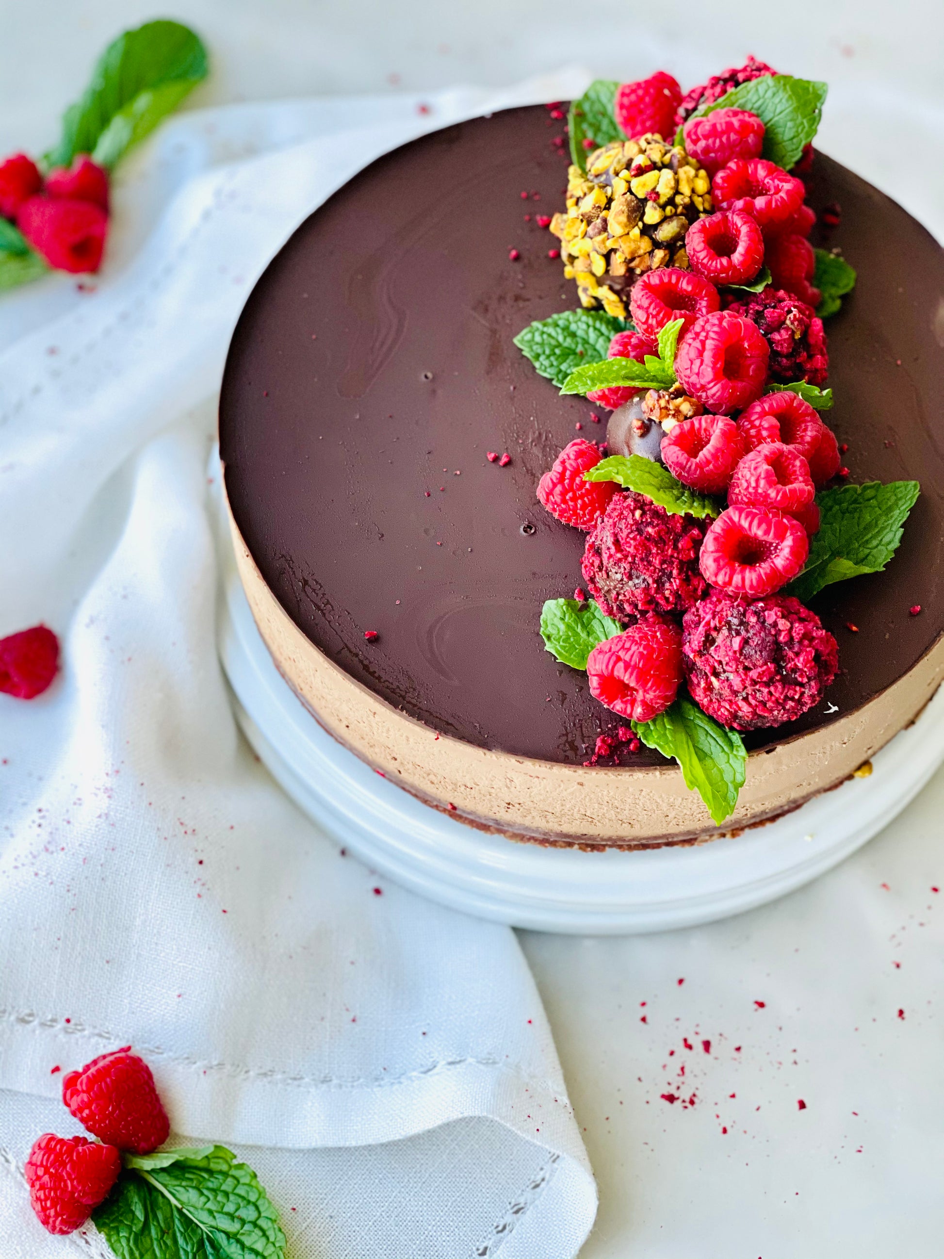 Berry cocoa crust. Raspberry mousse center. Chocolate cream. Fresh raspberry.