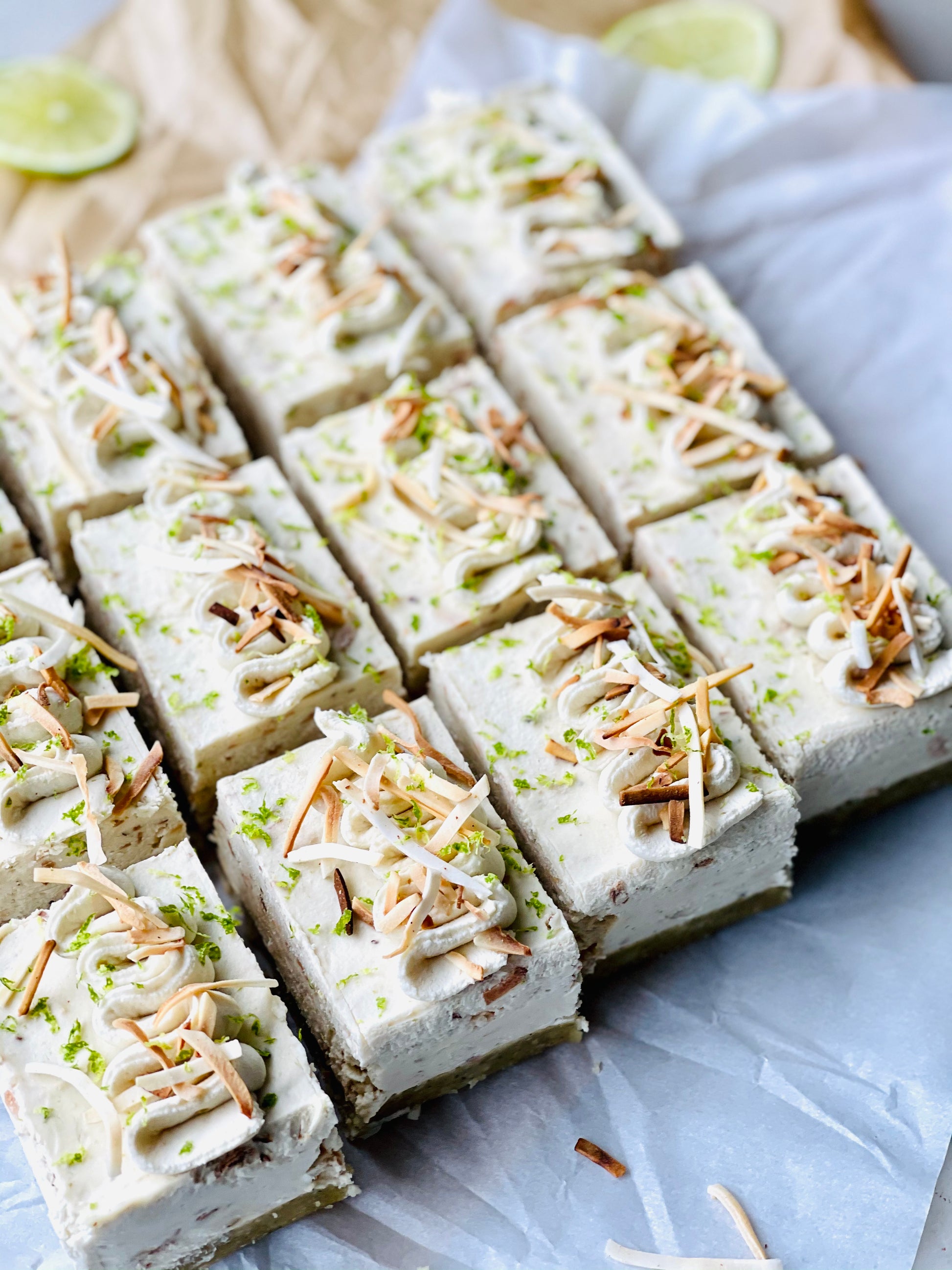 Almond coconut lime crust. Fresh squeezed lime juice & white coconut cream. Toasted coconut.