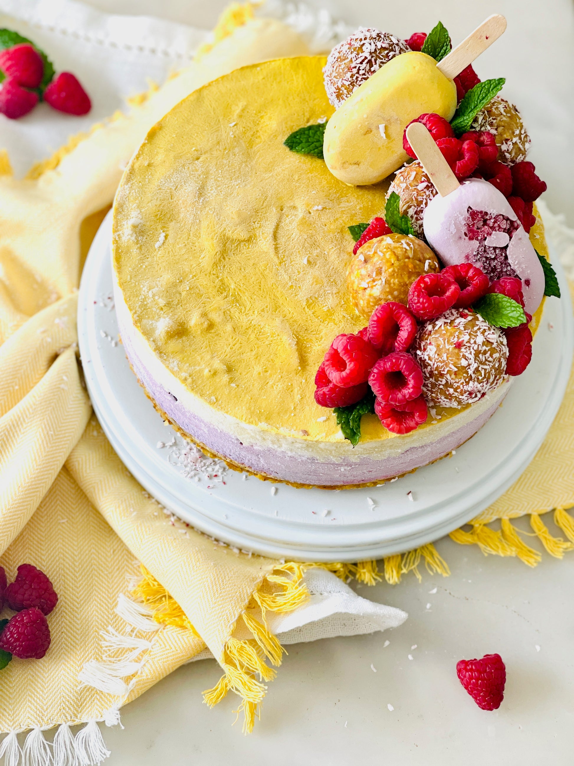 Ingredients: almond, coconut, dry mango, cashew, lemon, fresh mango, fresh raspberry, coconut milk, coconut oil, vanilla extract, agave.