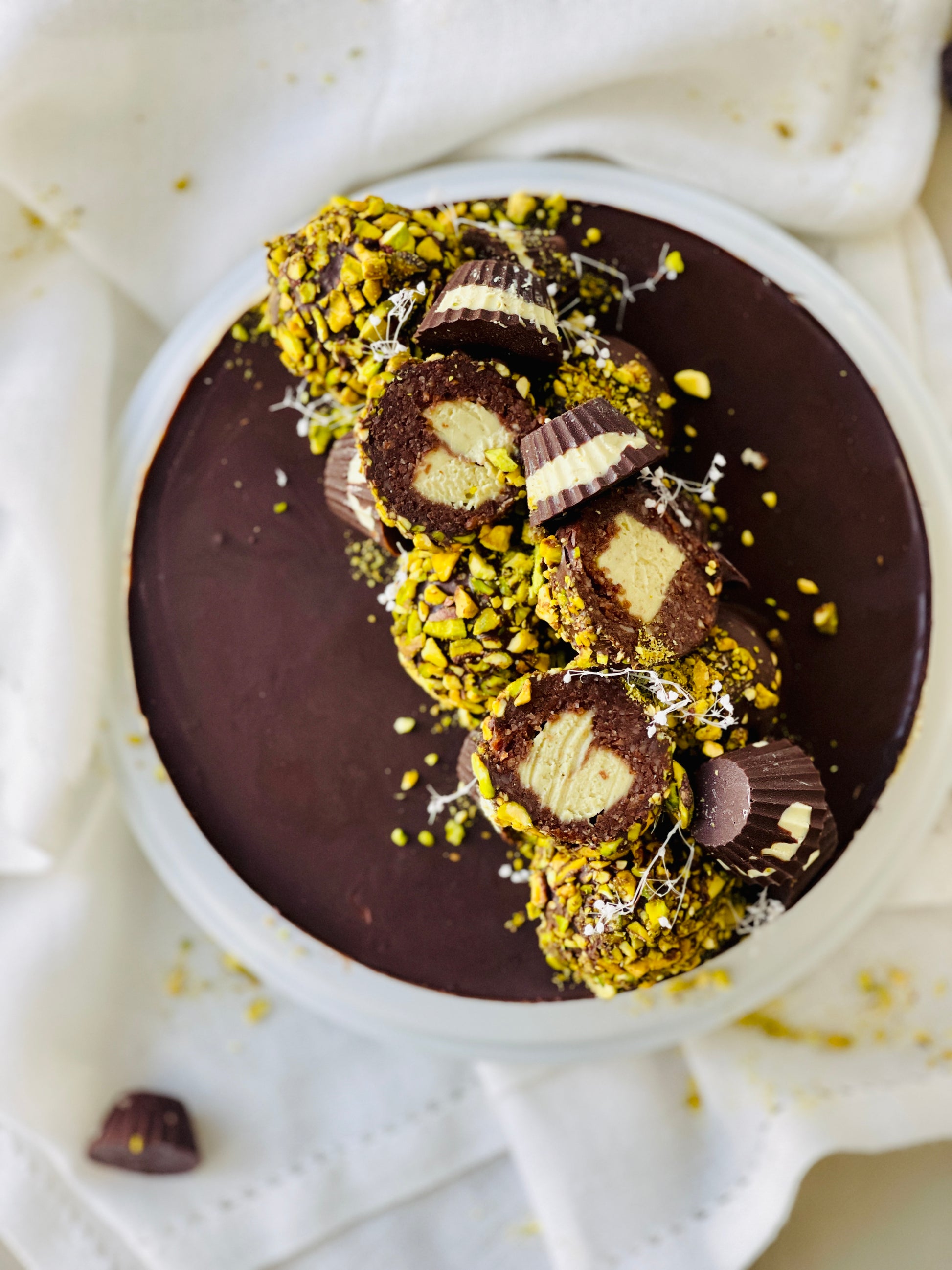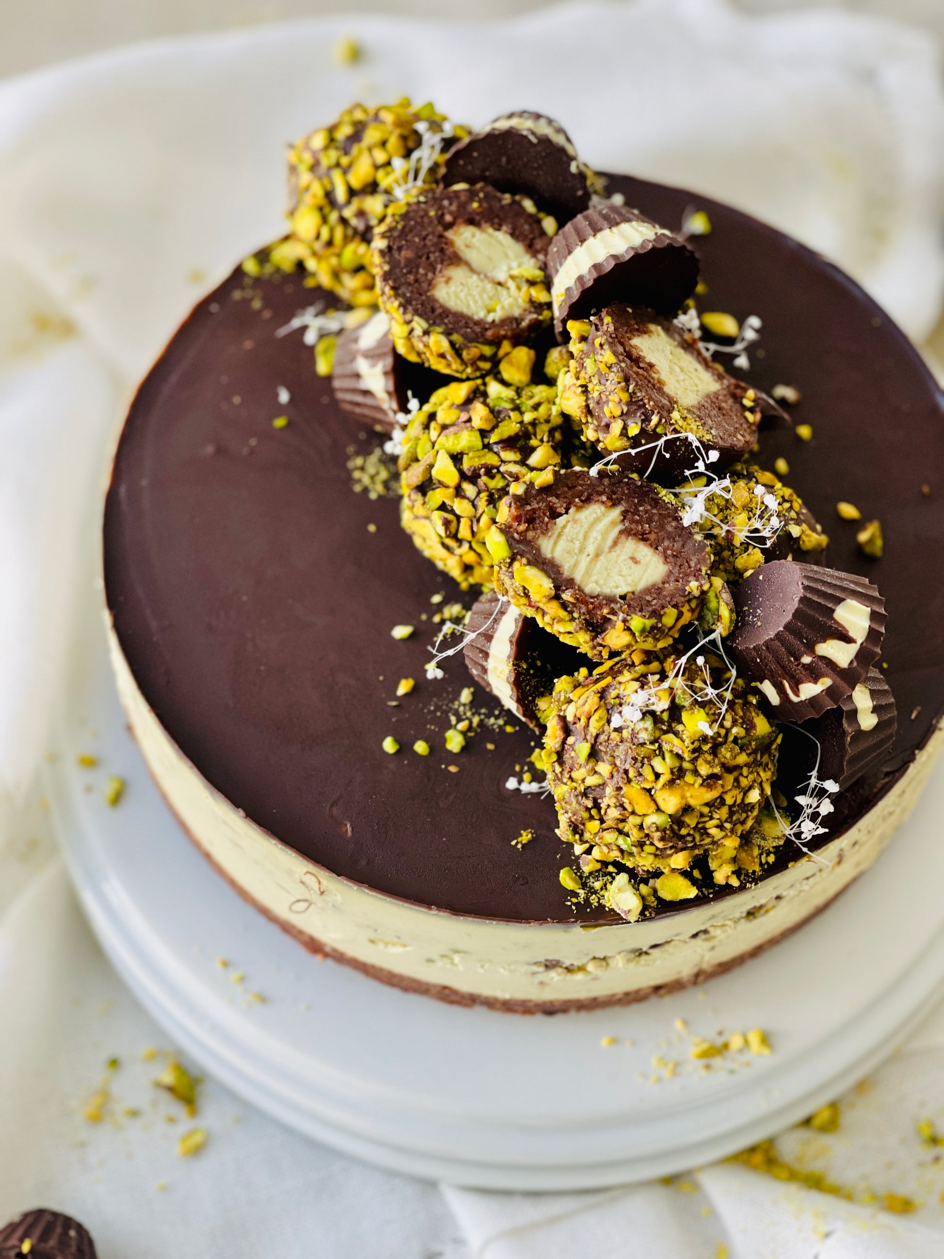 With lovely layers of luxurious pistachio cream, chocolate mousse, crunchy pistachio crumble and a decadent dark chocolate top, this chocolate pistachio cake is a two layer masterpiece! š¤©