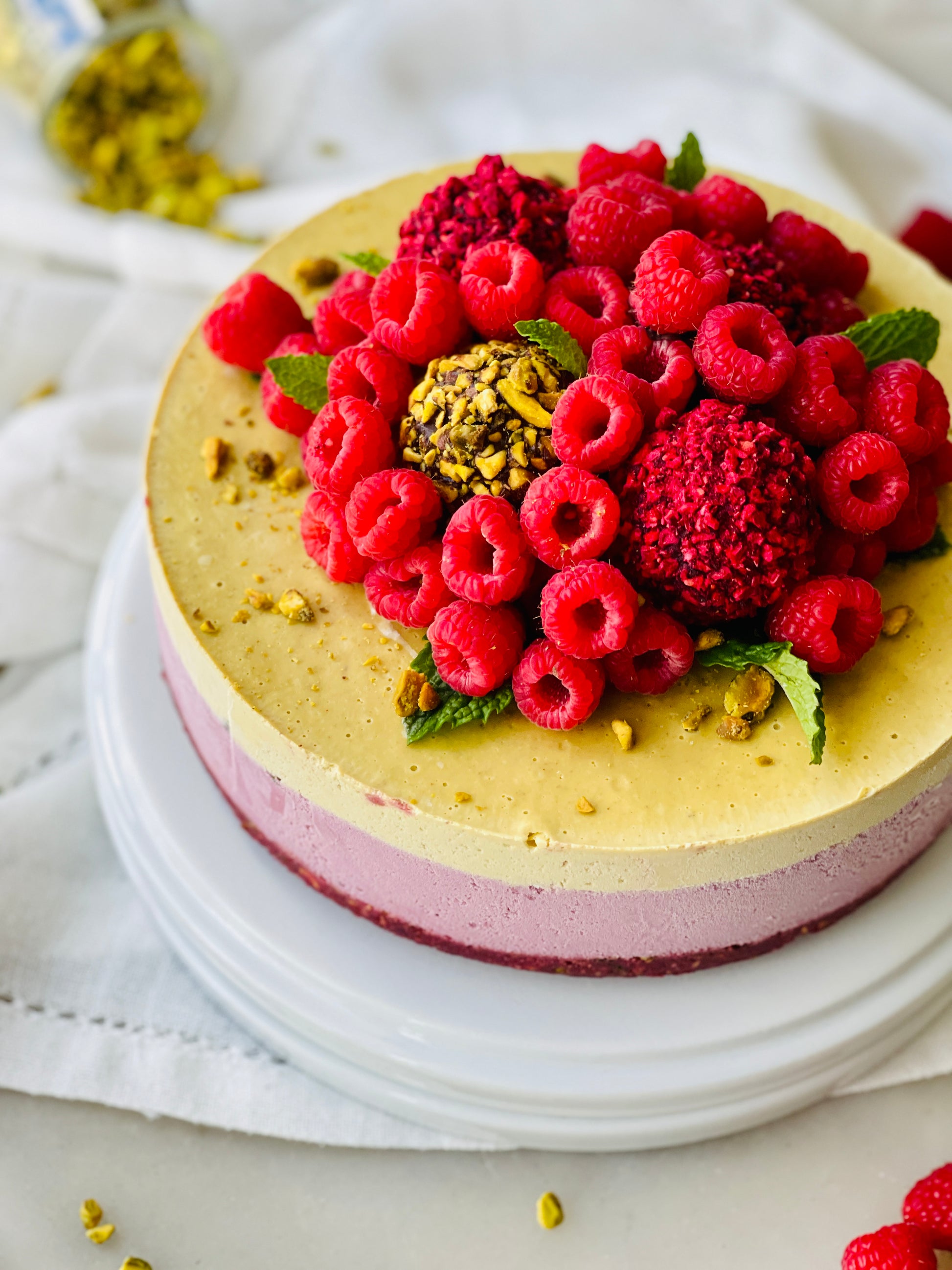 This indulgent pistachio and raspberry cheesecake combines the rich flavour of pistachios with a fresh and tart taste of raspberries. Perfect flavour combo and contrasting bright colours make this dessert a special treat.