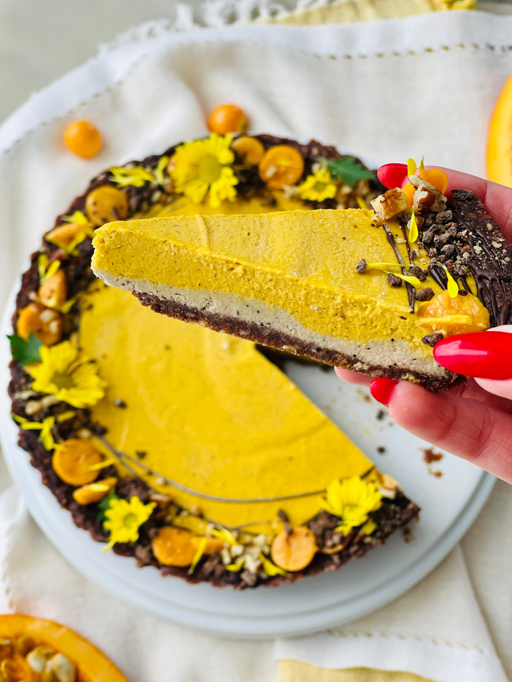 Walnut and pecan coffee layer. Espresso cream. Pumpkin mousse.