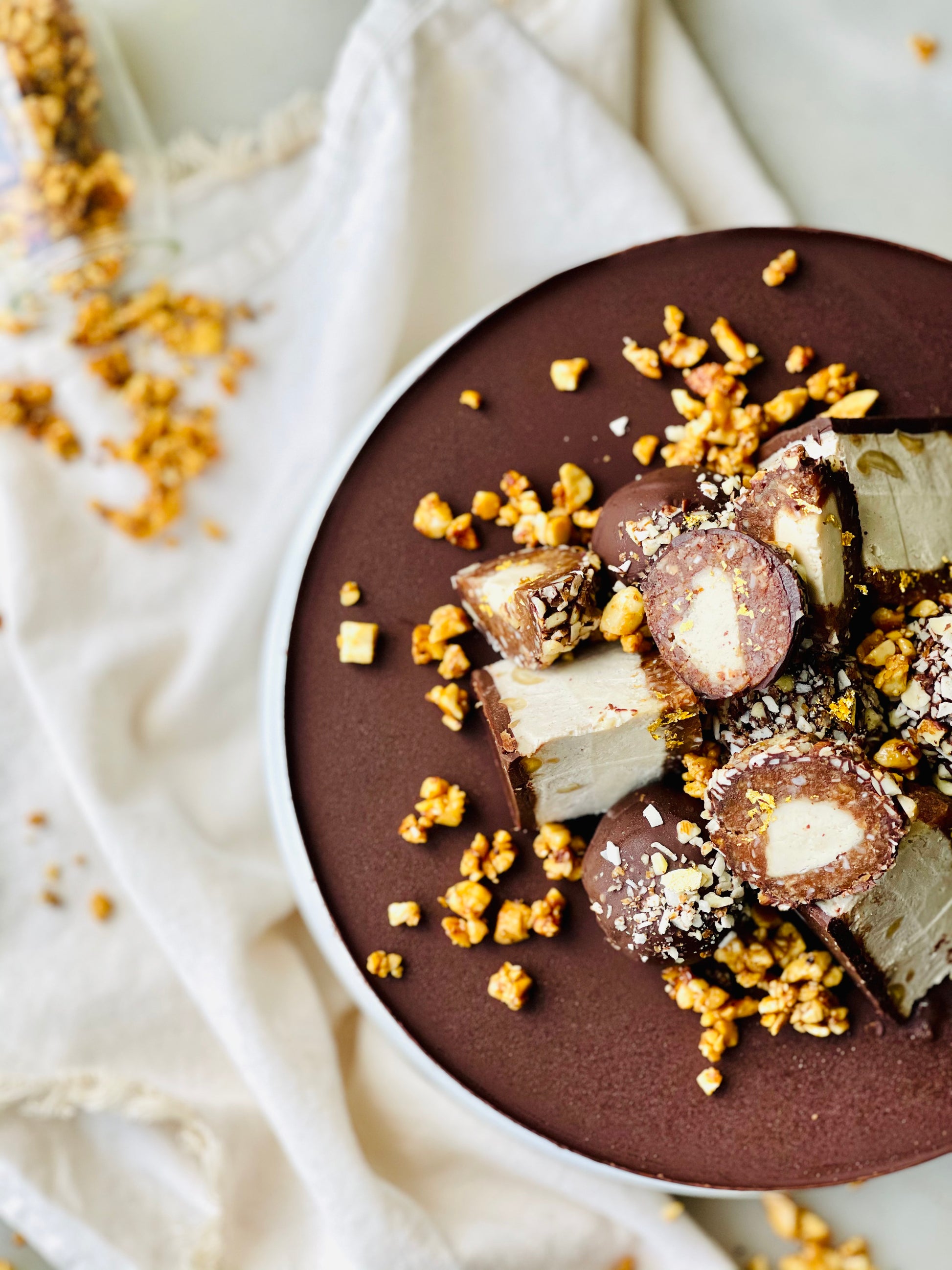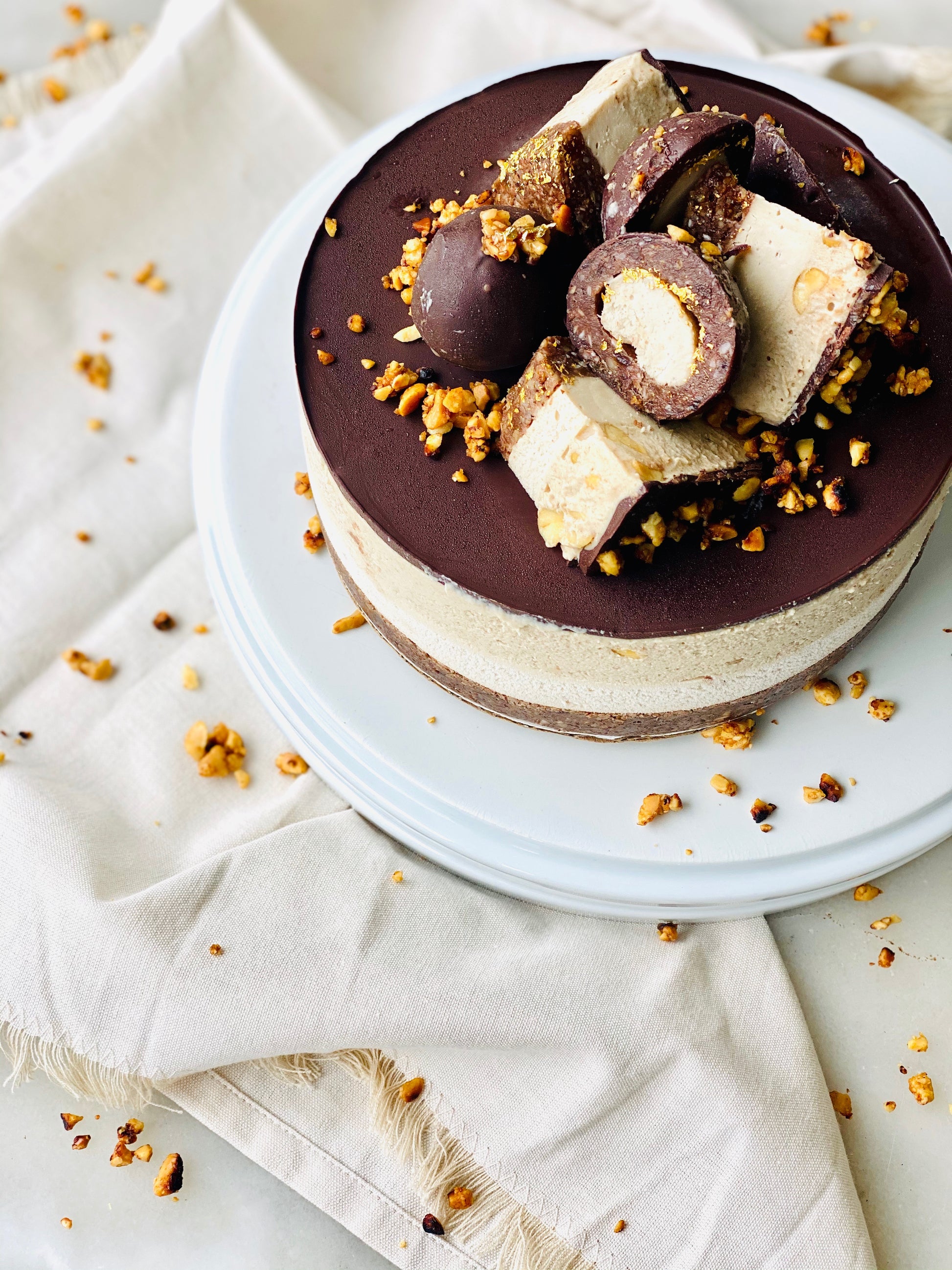 Amond cacao crust. Peanut butter cream. Date caramel cream. Roasted peanuts. Dark chocolate.