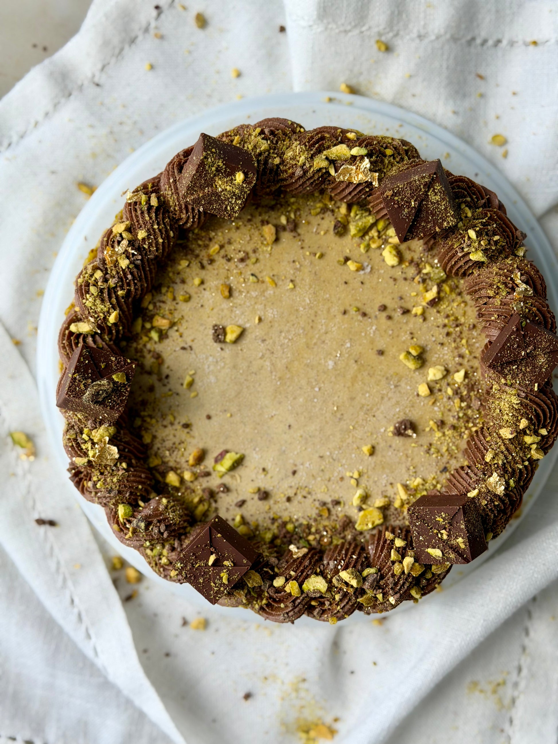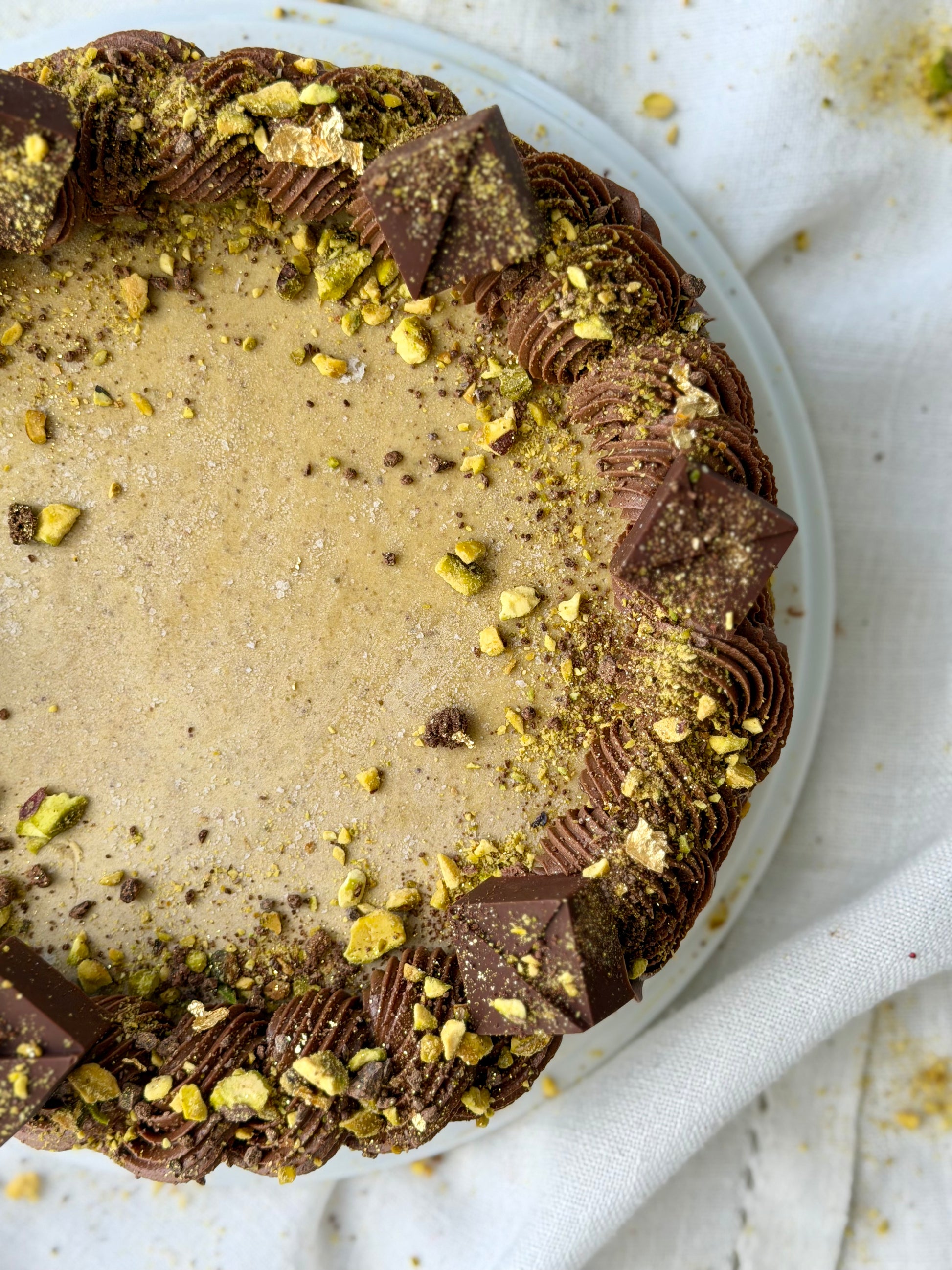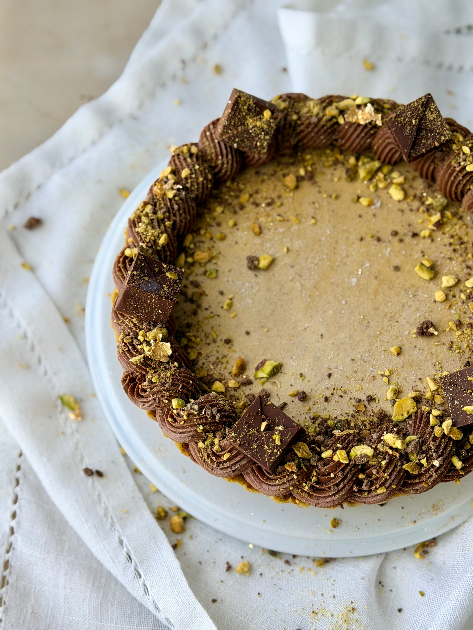 A luxurious harmony of textures and flavors - starting with a rich pistachio crust that brings a gentle nuttiness to every bite. On top lies a decadent layer of smooth chocolate cream, deep and velvety. The tart is finished with a silky pistachio nougat made from dates, creating a naturally sweet, melt-in-your-mouth finish that ties it all together. Each layer complements the next - nutty, creamy, and irresistibly refined.