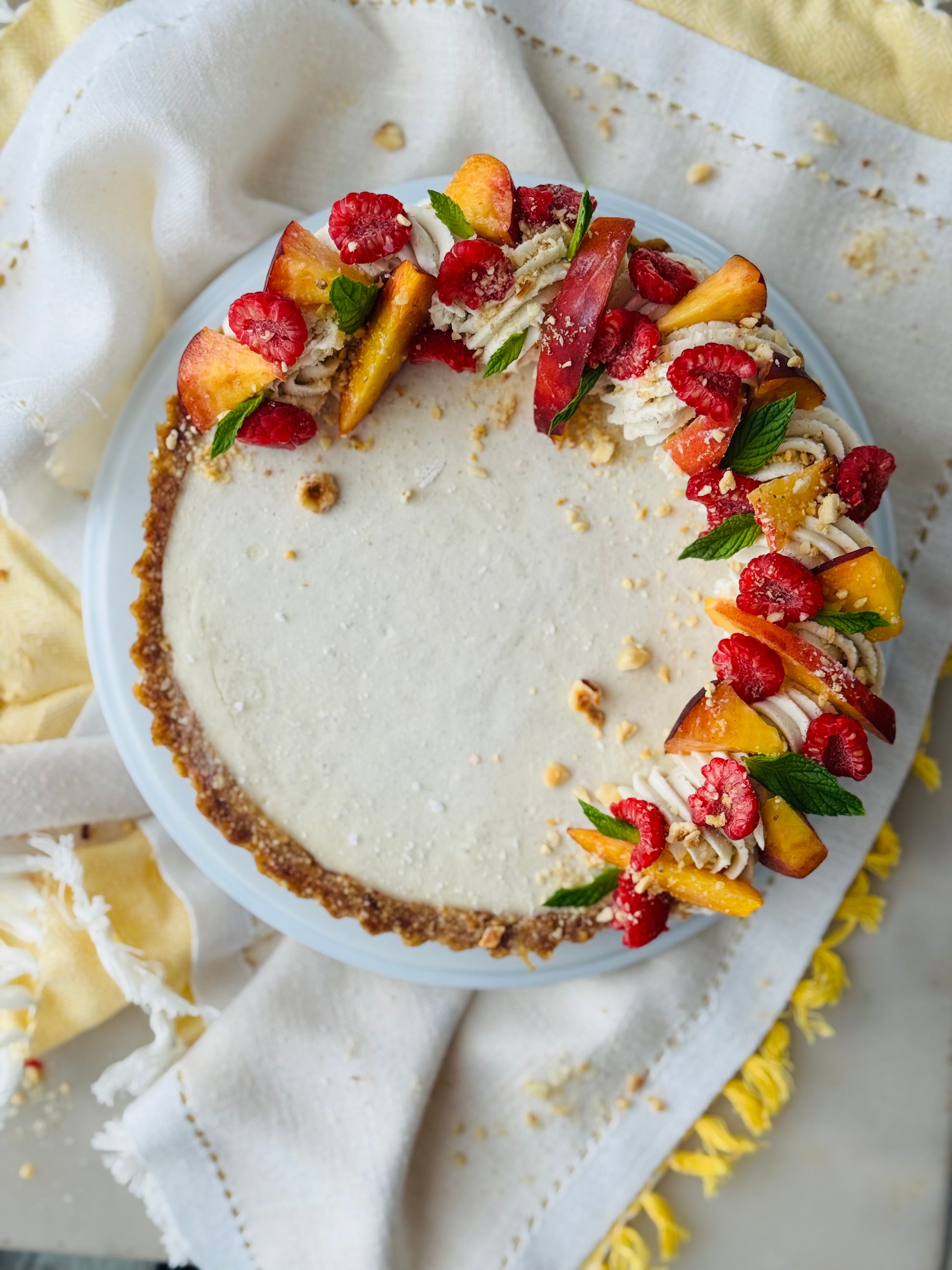 A golden hazelnut crust layered with juicy peach and roasted hazelnuts, finished with a smooth cloud of vanilla cream. Creamy, light, and refreshing, this tart is made for summer days and nights — where orchard sweetness meets nutty depth in the most effortless way.
